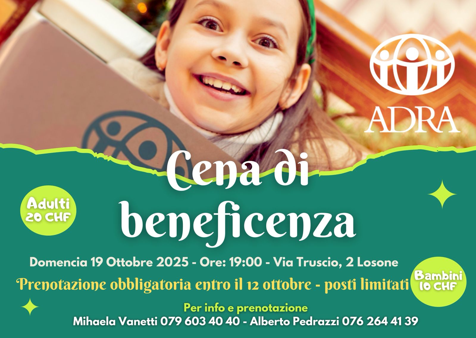 siamo lieti di invitarvi alla “Cena di Beneficenza ADRA“. Il ricavo verra devoluto al progetto Natale in cartone